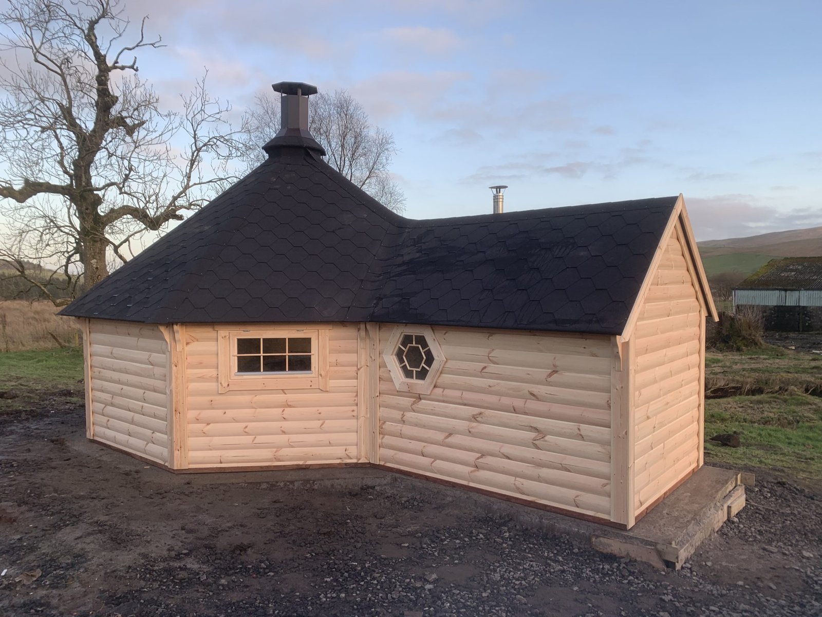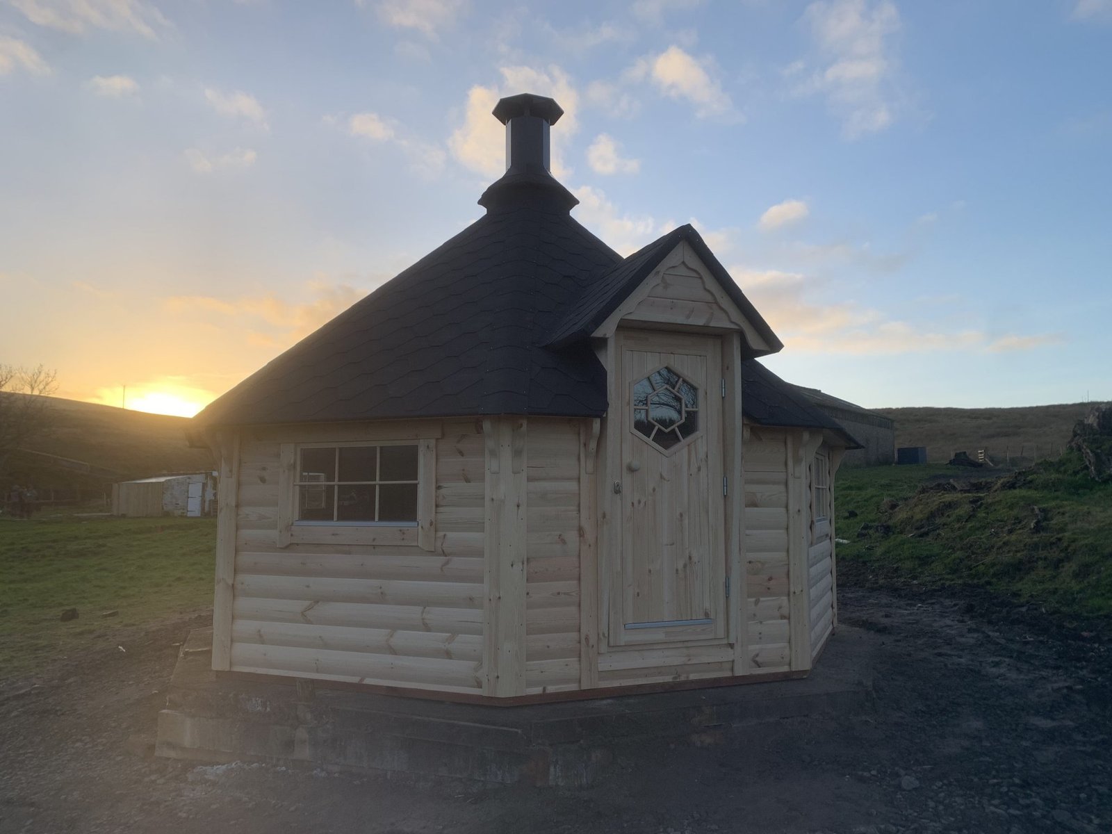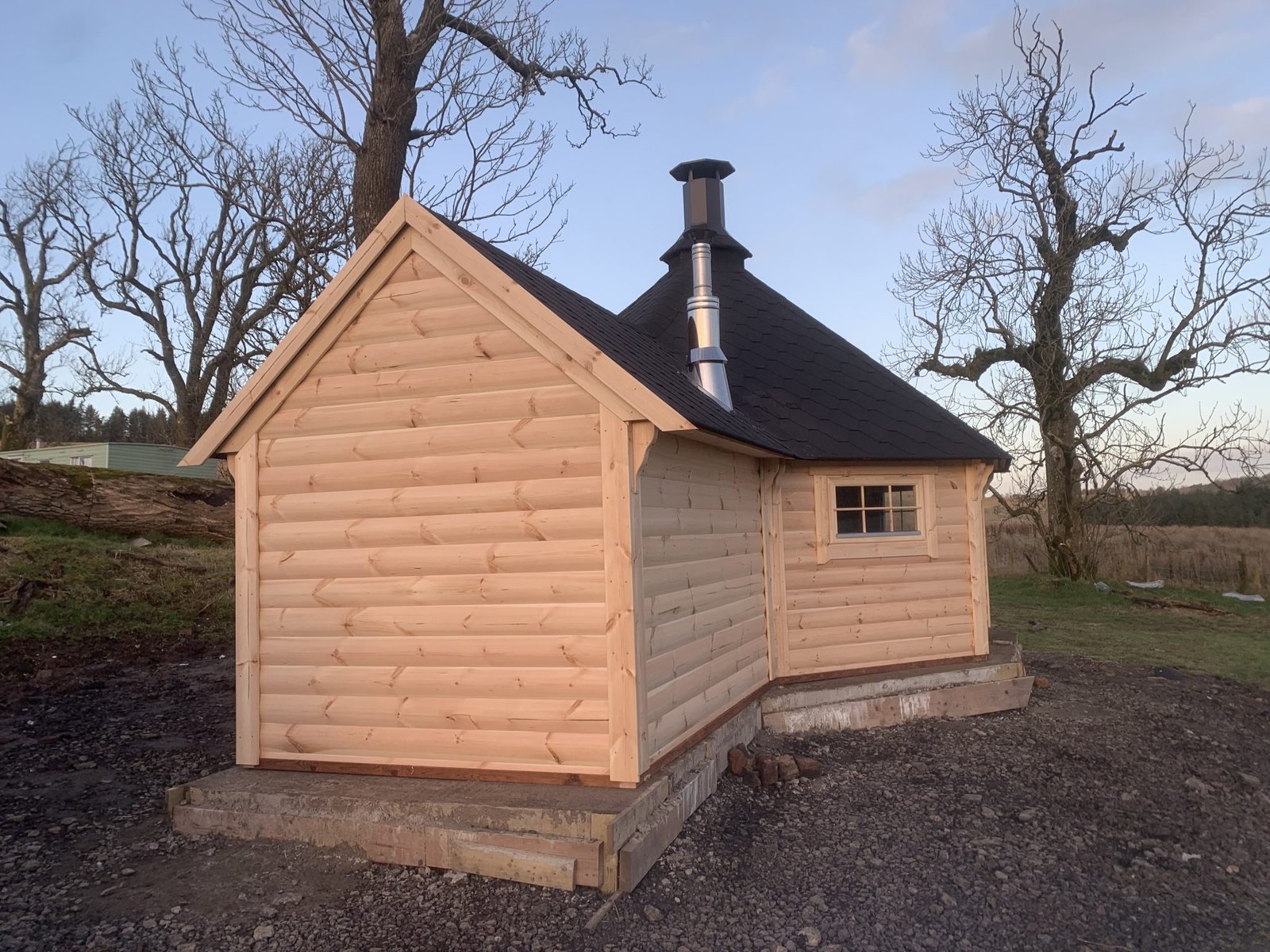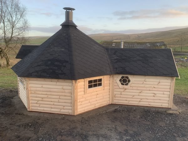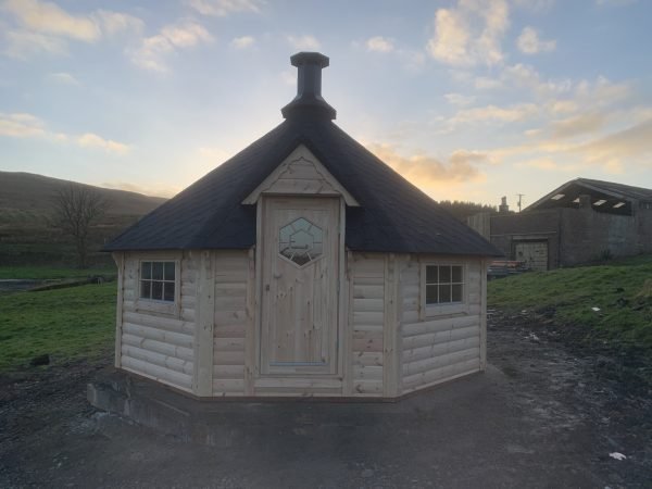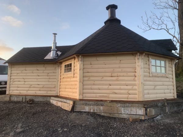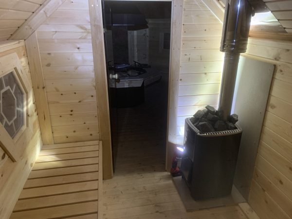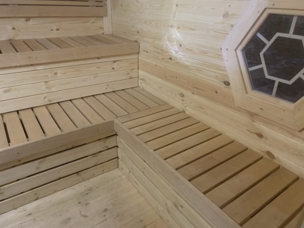 Standard Sauna Cabin set includes: straight walls, separate floor panels, insulated roof panels covered with bitumen shingles, double glazed hexagon windows, wooden door with double glazed hexagon window, wooden handle and the lock, inside benches, back rests, safety fence, heat-resistant plates for the heater/stove and inside tempered tinted glass door in saunas’ with changing room.