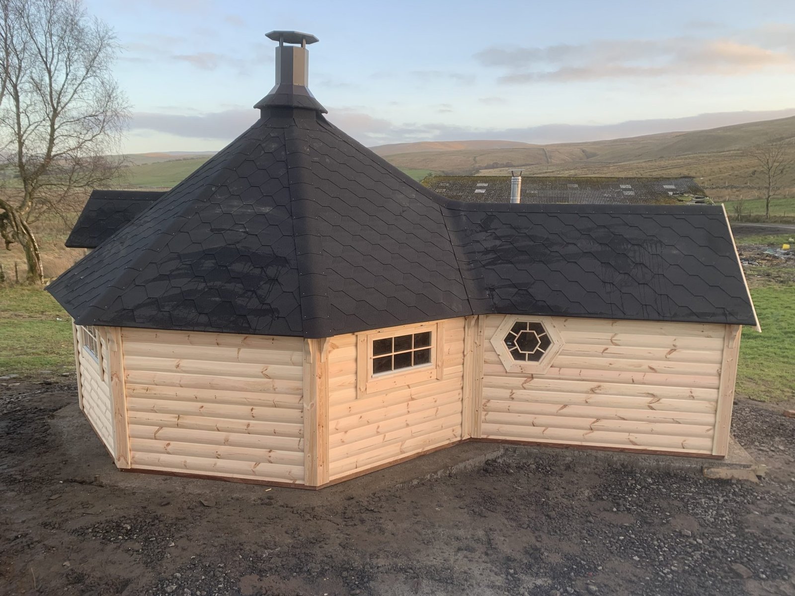 If sauna-grill cabin is chosen, the standard set also includes: Standard BBQ SET with the table fitted around it and extendable chimney.