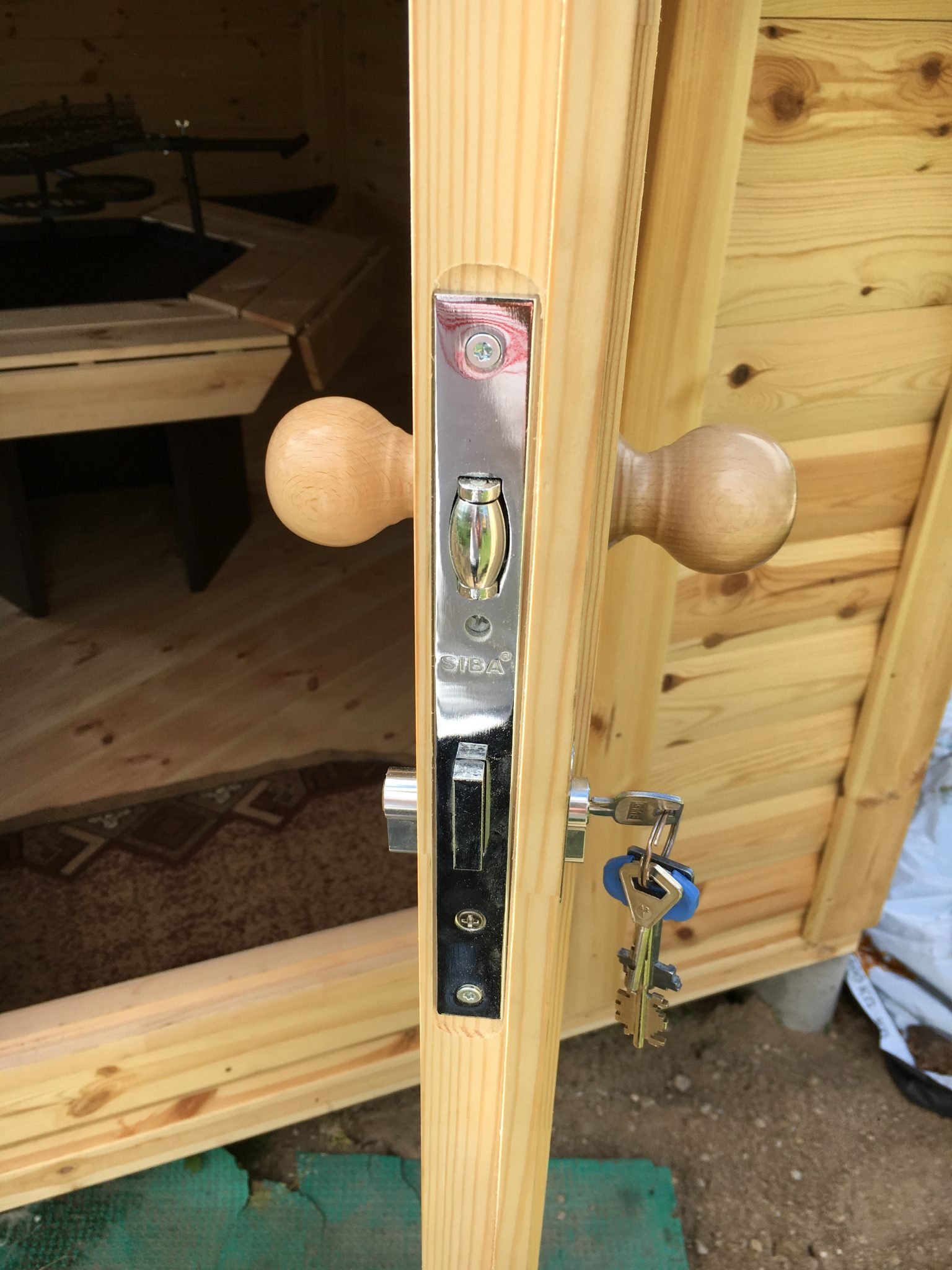 - Door with the double glazed hexagon window, wooden handle and the lock