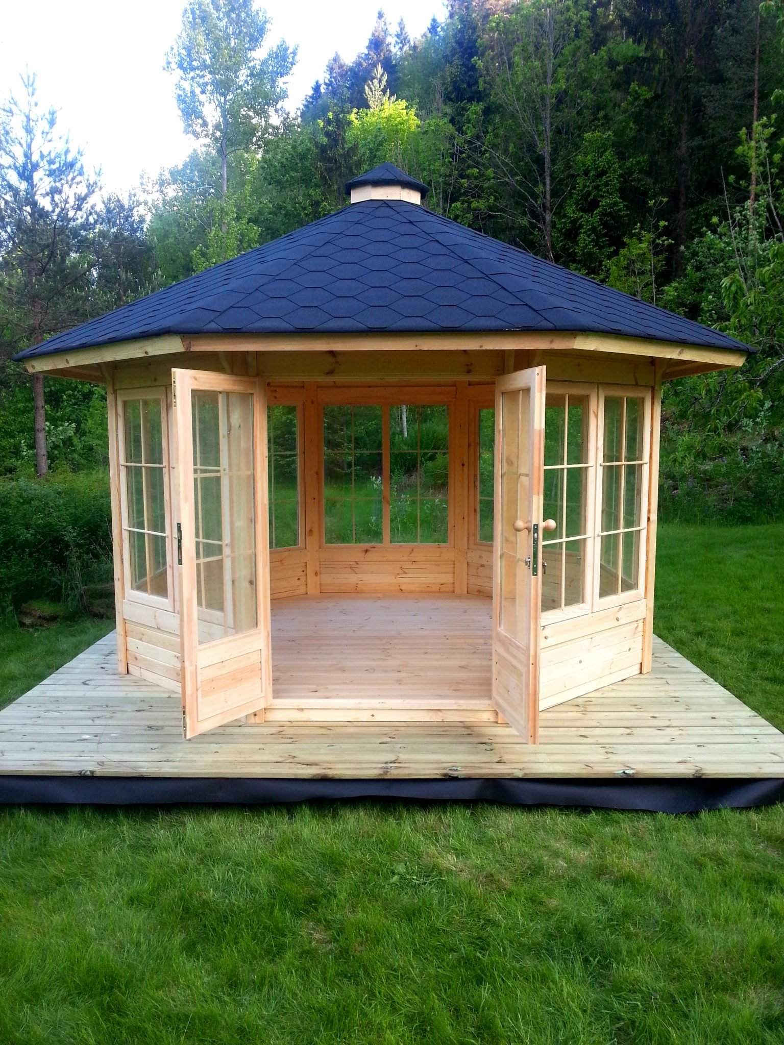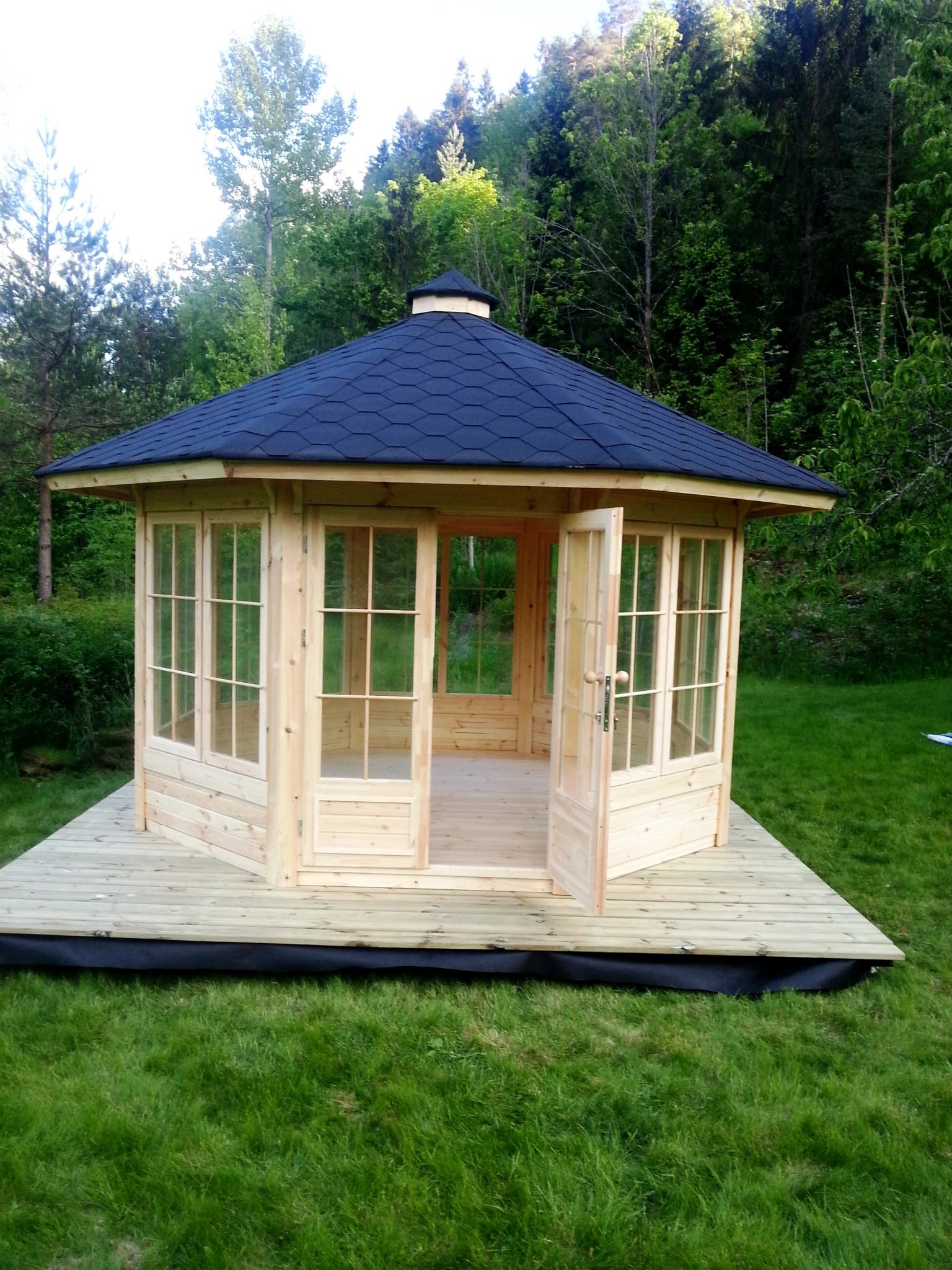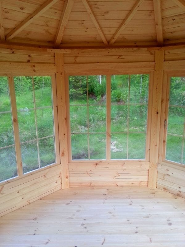 Pavilion models 9.2 m2 (hexagon shape), 14.9m2 (octagonal shape) and 16.5 m2 (octagonal shape) in the standard set contains: rounded pine board walls of 45 mm thickness, separate 18 mm roof panels covered with bitumen shingles, 18 mm floor panels, opening and fixed double glazed windows, French style double glazed door with the wooden handle and the lock, Standard BBQ and chimney SET, fitted with the table and benches around it. Benches come with the seat cushions and some of them can be extended for extra comfort.