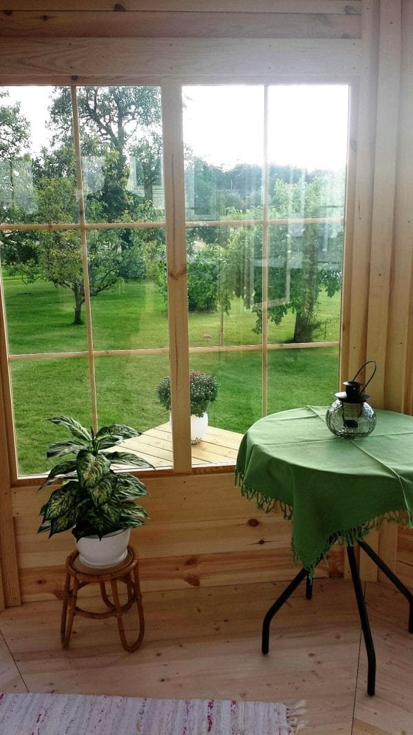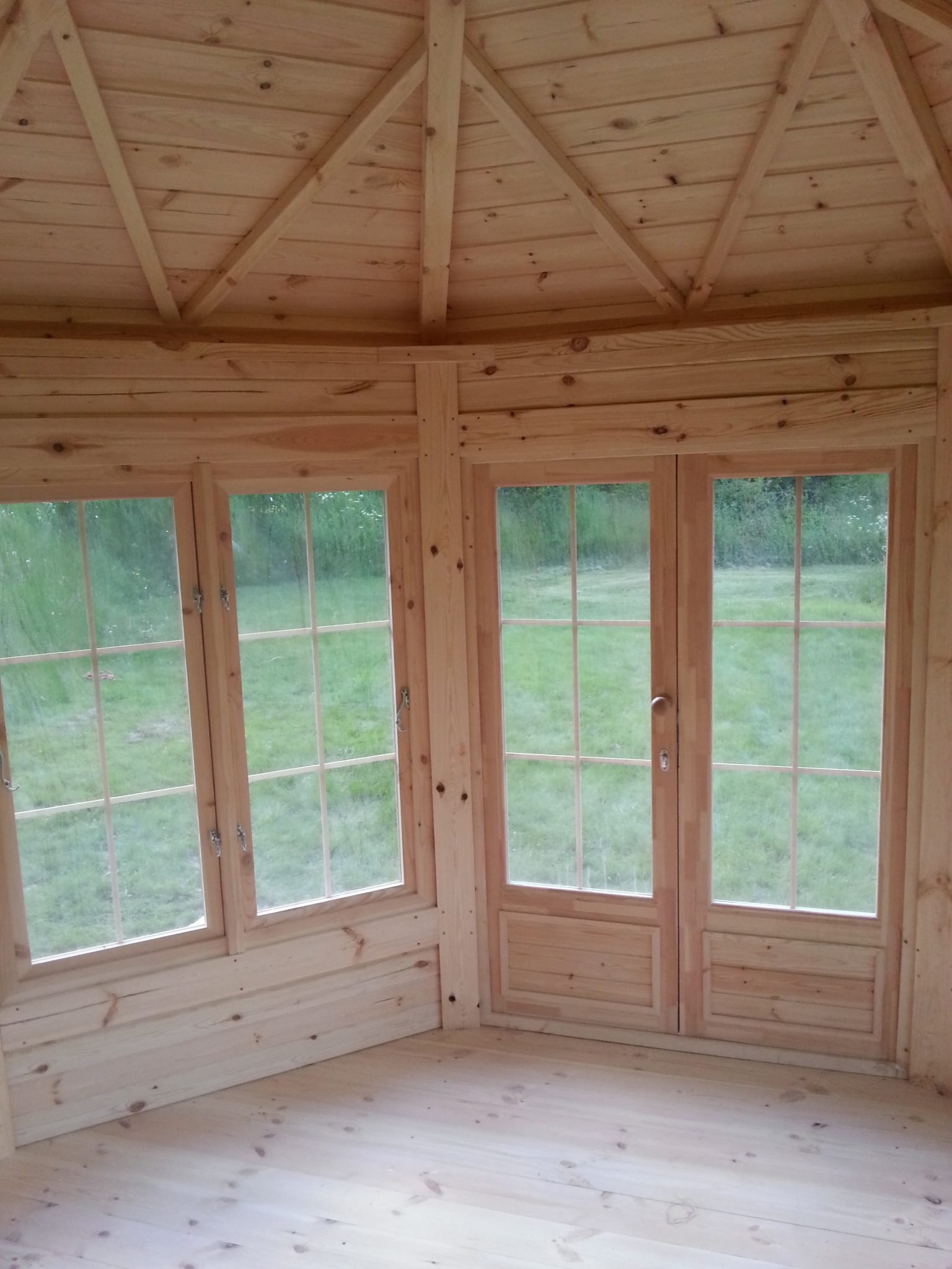 In the standard set Pavilion of 10 m2 maintains: 45 mm wall panels, opening and fixed double glazed windows, separate 18 mm roof panels covered with bitumen shingles, thicker floor panels of 28 mm, French style double glazed door with the wooden handle and the lock.