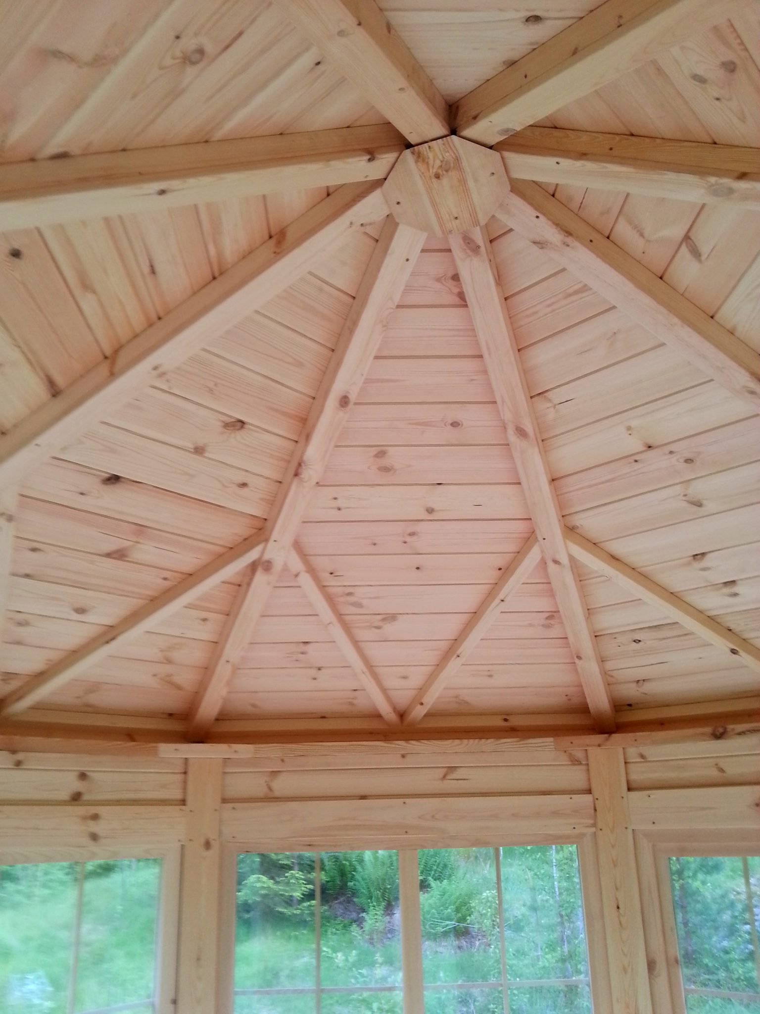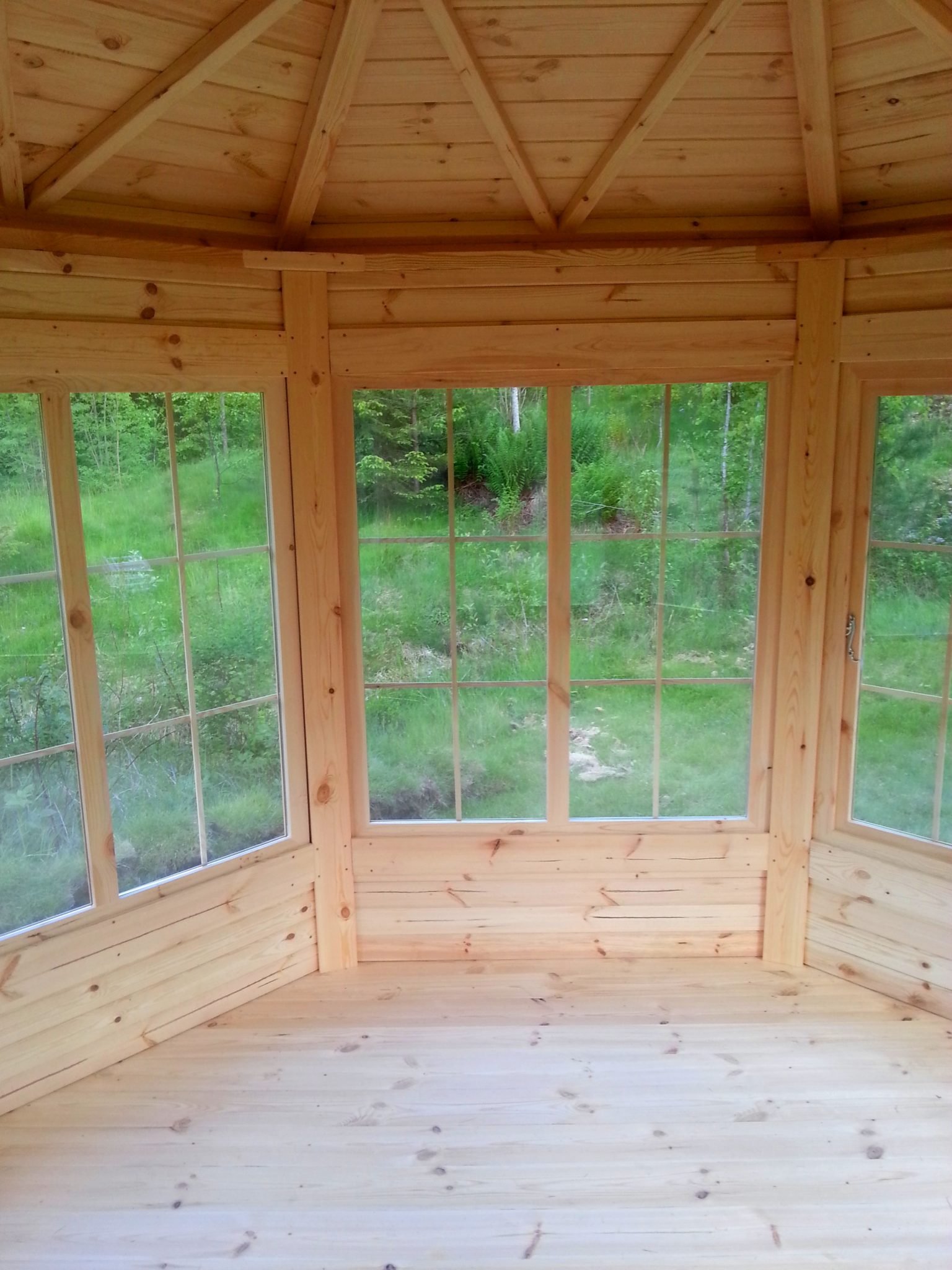 Pavilion of 10 m2, differently from other models, is produced from straight pinewood boards without rounding. The thickness of the wall is 45 mm and it is of octagonal shape. Differently from other models, this model comes without BBQ SET and benches.