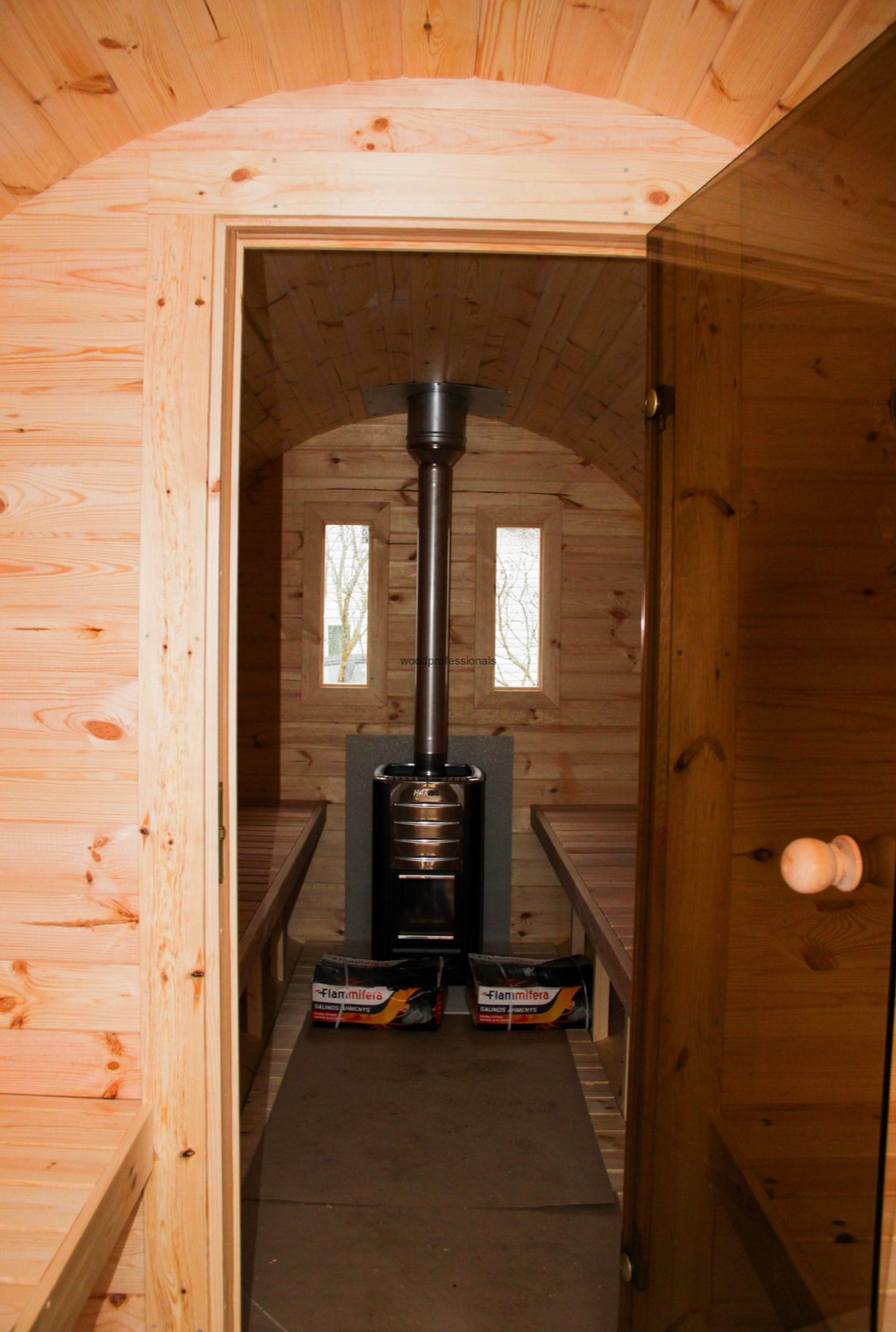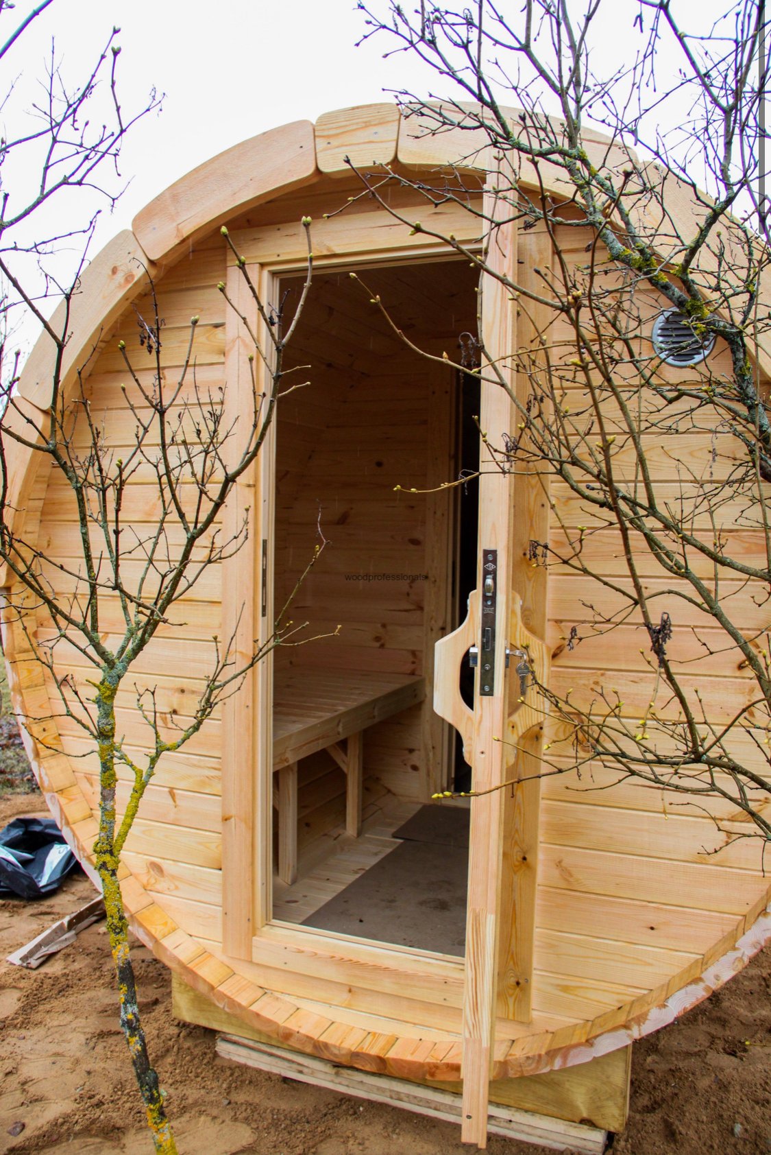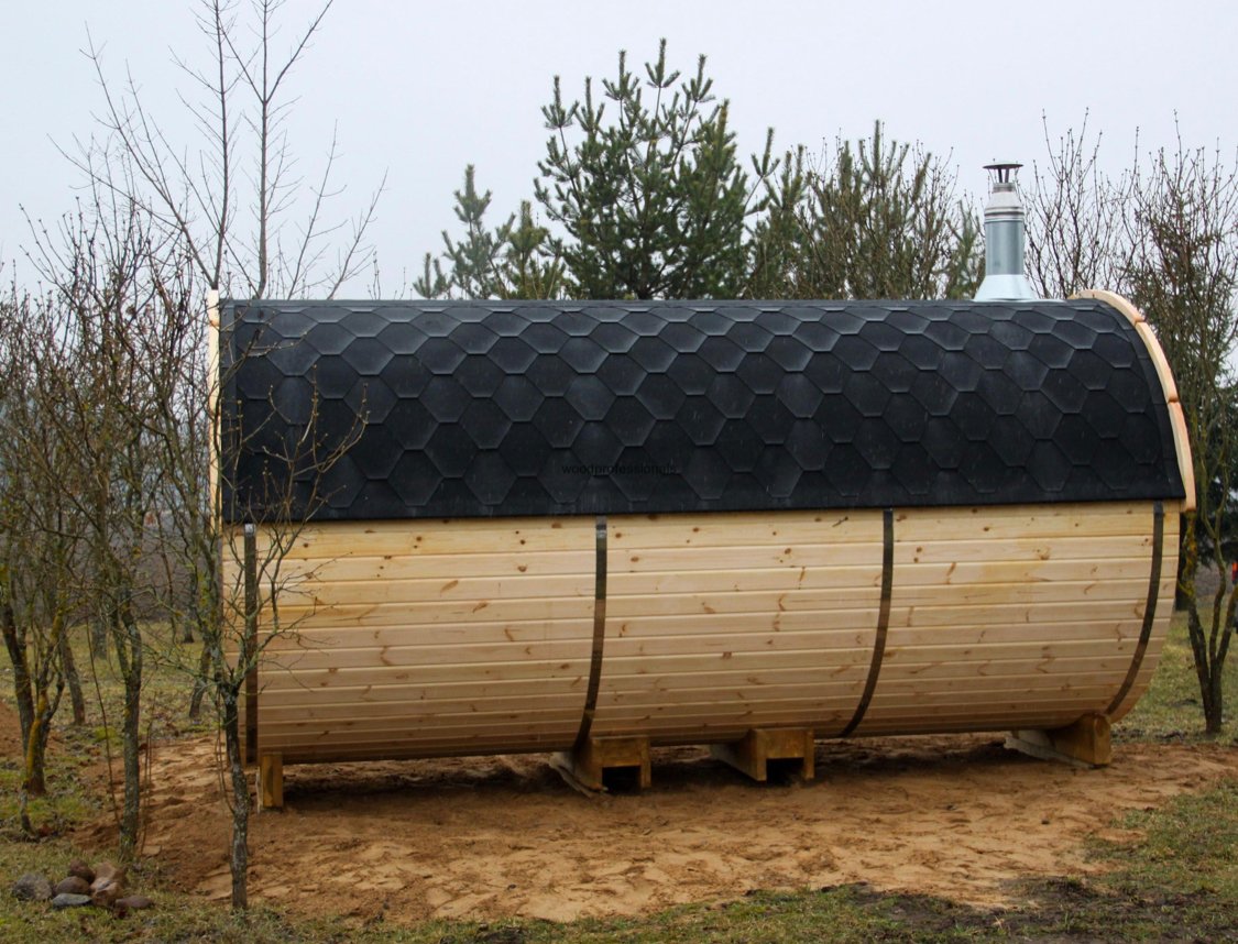 The standard set includes: wooden barrel, stainless steel tightening bands, terrace of 0.6 m (possible without terrace), roof covered with the bitumen shingles, wooden door with tempered double glazed window, wooden handle and the lock, 2 tempered double glazed windows mounted in the front or in the back side of the barrel, a tempered tinted glass door (if the barrels with changing room), heat-resistant plates for the heater, 2 benches made from Aspen or Black Alder.